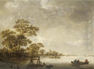 A River Landscape With Fishermen In Small Vessels Near The City Ofantwerp, With A Church Tower On The Right, Sailing Boats In Thebackground