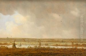 A River Landscape With Fishermen Drawing In Their Nets And A Town Beyond