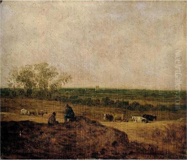 A Dune Landscape With Two Figures Conversing In The Foreground, Cattle Grazing In The Middle Distance, A Tower Beyond