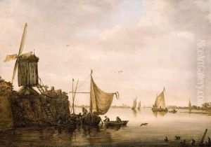 A River Landscape With Men Unloading A Waterschip By A Landingstage With A Windmill, Kaags And A Smalschip Beyond