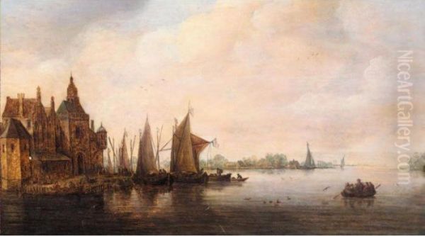A River Landscape With Various Vessels Moored Beside A Quay