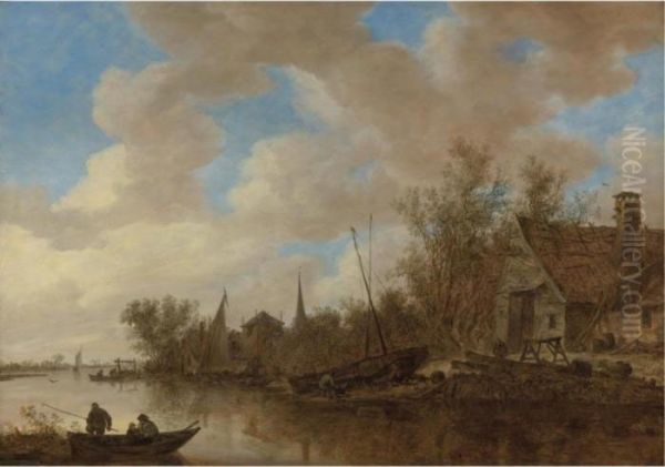 River Landscape With Men Fishing From Boats And Men Repairing A Boat Before A Wooden House