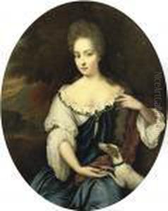 Portrait Of A Lady, Three-quarter-length, In A Blue Dress With Awhite Chemise And A Crimson Wrap With A Dog By Her Side