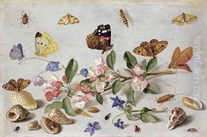 Butterflies moths and other insects with a sprig of apple blossom