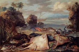 An Allegory of water a sea nymph by a reedy shore with Fish Shells and Birds nearby the Triumph of Amphitrite beyond