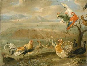 Wooded Landscape with a Cock Turkey Hens and other Birds
