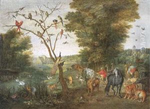 A Wooded River Landscape With Peasants And Travellers On A Path, A Town Beyond