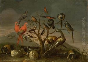 A Cock, Hens, A Turkey, Guinea Fowl, Finches And Other Birds By A Plinth In A Wooded Landscape
