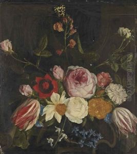 A Stone Cartouche Surrounded By Garlands Of Tulips, Roses, Carnations And Other Flowers With Saint Genevieve