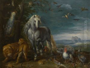 A Hilly Landscape with a Peacock, an Eagle and other Birds