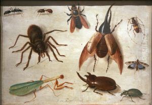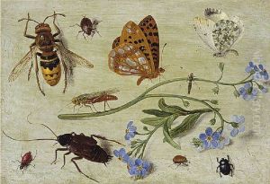Swags of Tulips, Roses, Lilies, Carnations, Hyacinths, Cornflowers, Forget-me-Nots and other Flowers decorating a stone Cartouche with a Relief of the Christ Child, with a Dragonfly, Moths and other Insects