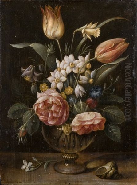 Rose, Tulipani, Fiordalisi E Altri Fiori In Un Vaso Di Vetro Su Un Tavolo