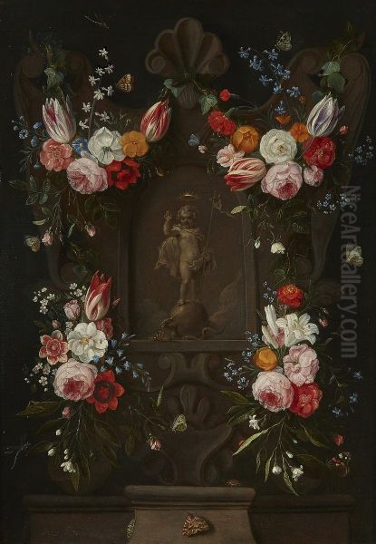 Swags of Tulips, Roses, Lilies, Carnations, Hyacinths, Cornflowers, Forget-me-Nots and other Flowers decorating a stone Cartouche with a Relief of the Christ Child, with a Dragonfly, Moths and other Insects