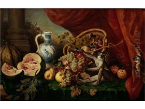 Fruits Dans Un Plat En Delft, Perroquet Et Ecureuil Sur Un Entablement; Et Un Panier De Fruits, Tortue Et Cochon D'inde