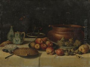 Still Life Of Fruit, A Pie, A Large Copper Pot, A Blue And White Porcelain Pitcher And Vase And Other Objects, All On A Table