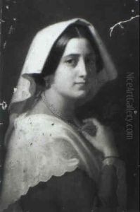 Portrait Of A Lady, Half Length, Wearing Pearls And A Grey Satin Gown With A Blue Shawl, And Ornamental Garden Beyond