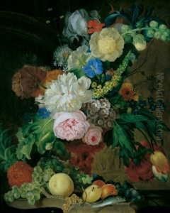 Still Life Of Grapes, Quince, Fig, Melon, Medlar, Pineapple, Peaches, Plums, Raspberries, Sweetcorn, Poppies, Roses, Hollyhocks, Morning Glory