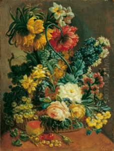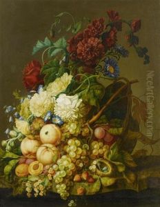 A Still Life With Peaches, Grapes, Raspberries Together With Various Flowers On A Stone Ledge