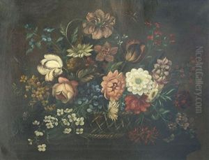 A Still Life With Roses And Other Flowers In A Glass Vase Together With A Bird's Nest, All Resting On A Stone Ledge
