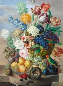 Still Life Of Fruit And Flowers, Together With Walnuts And Hazelnuts, A Bird's Nest And A Goldfish Bowl, A Landscape Beyond