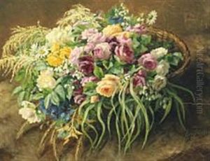 Hollyhocks And Fruit On A Marble Ledge With A Goldfinch