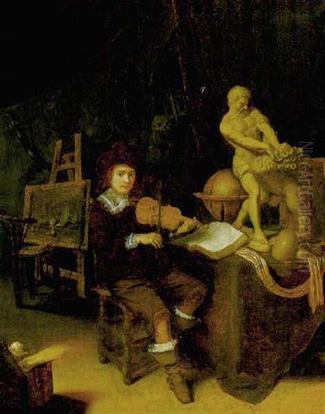 Self Portrait Of The Artist Seated, Playing A Violin Beside A Table With A Statue On It