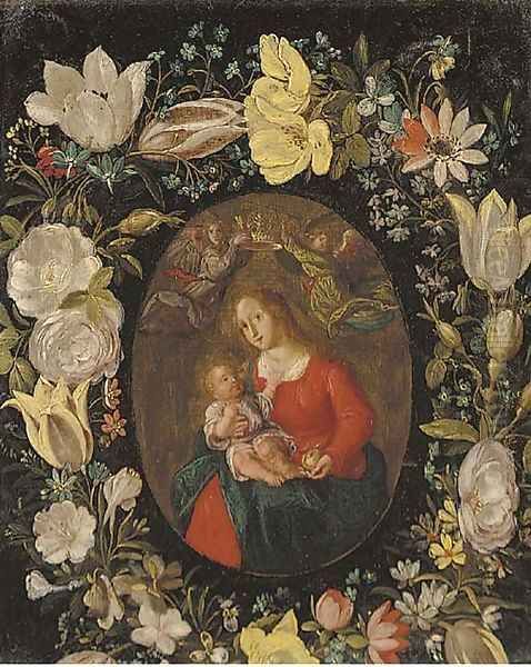 The Virgin and Child set in a feigned cartouche of tulips, roses and other flowers