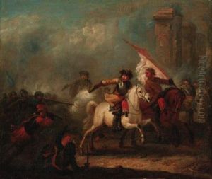 A Cavalry Skirmish Next To Roman Ruins. Oil/canvas/canvas