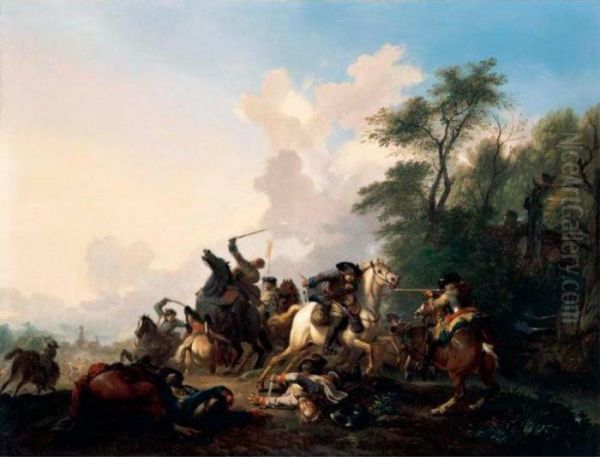 A Cavalry Skirmish In A Wooded Landscape