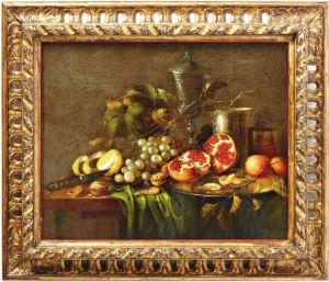 A Lobster, A Nautilus, Figs, Oysters, A Split Pomegranate, Aporcelain Bowl With Plums, Peaches And Grapes In A Basket, Glassesand A White Cloth