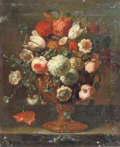 Roses, Carnations, Tulips, Narcissi And Other Flowers In An Earthenware Vase On A Table Top