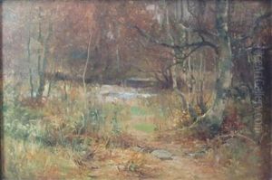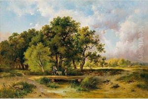 Children Paddling In A Stream Below A Bridge And A Shrine
