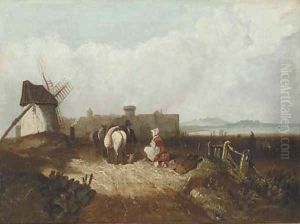 Personnages Au Bord D'une Riviere Au Pied D'une Ville Fortifiee