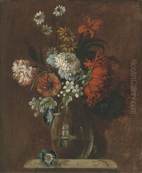 Morning Glory, Carnations, Chrysanthemums, A Lily And Other Flowers In A Glass Vase On A Pedastal
