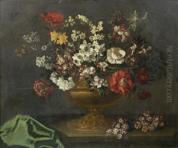 Poppies, Narcissi, Orange Blossom And Other Flowers In A Bronze Urn With Auriculas On A Stone Ledge Draped With A Green Cloth