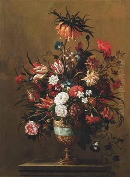 Tulips, Peonies, Carnations, Morning Glories And Other Flowers In A Bronze Urn On A Stone Ledge