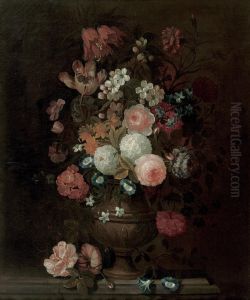 A Still Life With A Bouquet Of Flowers In A Bronze Urn On A Stone Ledge