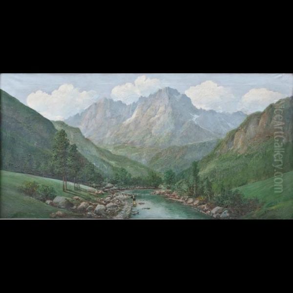Veduta Fluviale Con Montagne E Pescatore