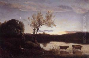 Pond with Three Cows and a Crescent Moon