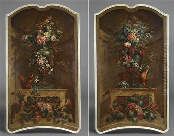 Bouquet De Fleurs Dans Un Vase Orne Et Un Perroquet (+ Another; Pair)