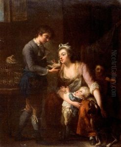 An Amorous Couple With Doves In A Cage And A Dog