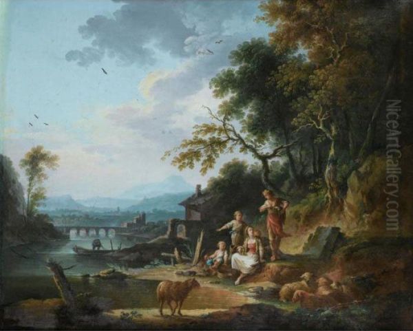 Le Repos D'une Famille De Paysans Dans Un Paysage De Riviere