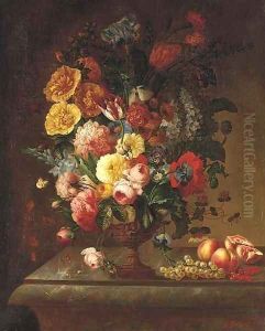 Tulips, Roses, An Iris, Morning Glory, A Hydrangea And Otherflowers In A Classical Urn On A Plinth With Grapes, Redcurrants,peaches And A Pomegranate