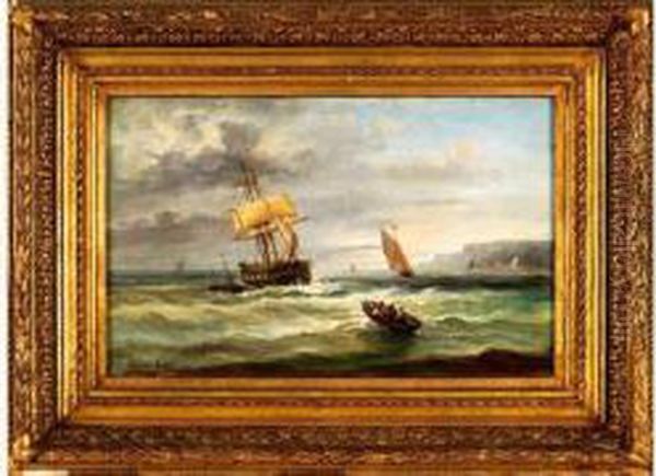 Vaisseaux Et Chaloupe Par Mer Forte, Non Loin Des Cotes Normandes