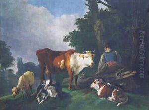 Berger Dans Une Etable Avec Un Boeuf, Un Ane, Un Mouton Et Un Chat