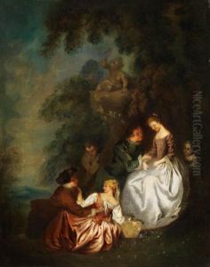 A Wooded Landscape With A Huntsman Offering A Rabbit To An Elegant Lady