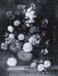 Carnations, Tulips, Roses And Narcissi In An Urn On A Ledge