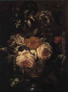 Still Life Of Tulips, Roses And Other Flowers In An Elaborate Urn