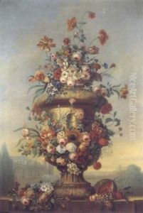 Stillleben Mit Blumen In Einer Vergoldeten Prunkvase Auf Einer Steinernen Treppe Und Pfirsichen, Feigen Und Melonen In Einer Landschaft