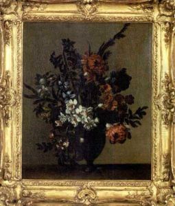 Corbeille De Fleurs Sur Un Entablement, Pres D'une Draperie